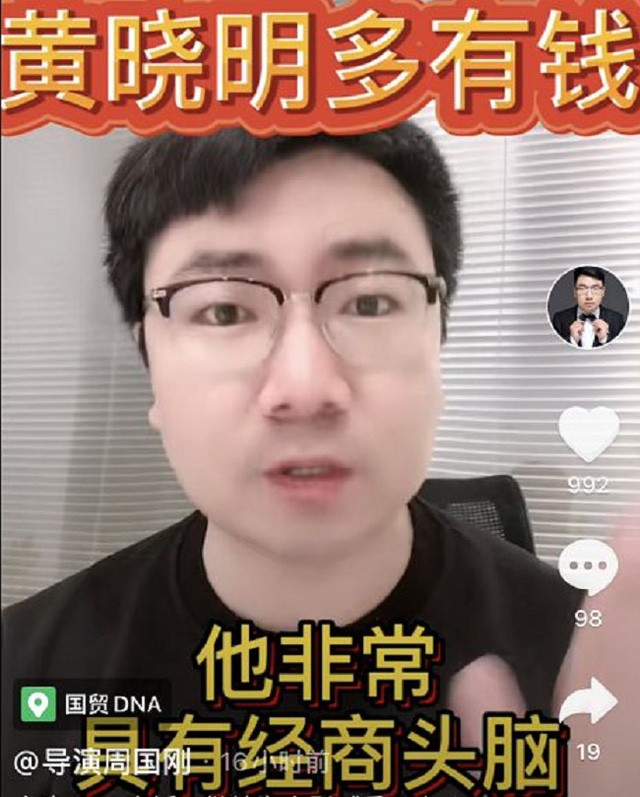 Mới đây, một người tự xưng là "đạo diễn Châu Quốc Cương" đã đăng một video nói về tình hình hiện tại của Huỳnh Hiểu Minh – Angelababy. Người này cho biết, dù sự nghiệp của Huỳnh Hiểu Minh những năm qua đã tụt dốc nhưng anh có địa vị cao trong giới, nhờ đầu tư vào hơn 60 công ty nên hiện giờ nắm trong tay khối tài sản ước chừng 5 tỷ Nhân dân tệ (khoảng 17.800 tỷ đồng).