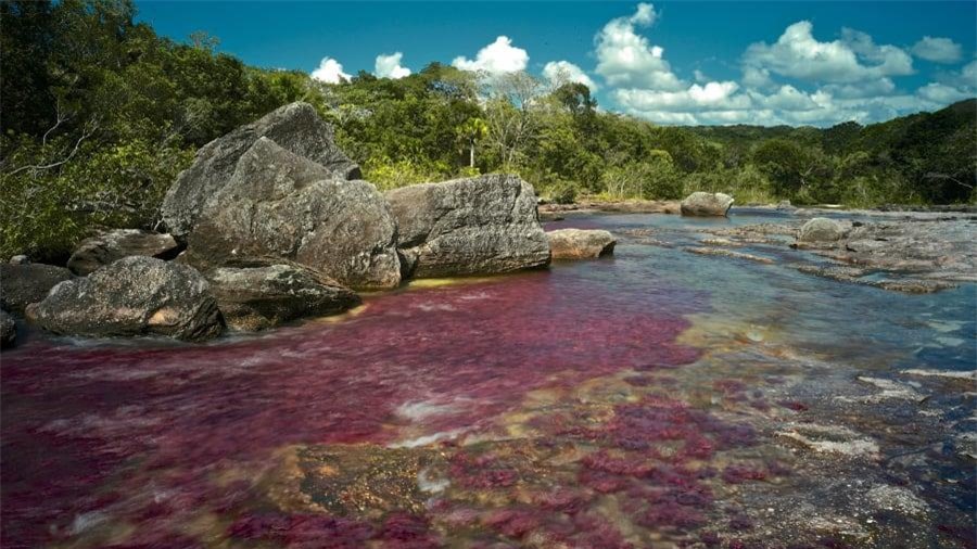 5.Cano Cristales, Colombia:Cano Cristales là địa điểm du lịch nổi tiếng thế giới, nơi được mệnh danh là "dòng sông màu sắc". Trong khoảng thời gian giữa mùa khô và mùa mưa tại đây, du khách sẽ được chiêm ngưỡng rất nhiều màu nước đa dạng từ đỏ, cam, xanh lục, vàng. Điều này được lý giải là do macarenia clavigera, một loại tảo đặc biệt được tìm thấy dưới lòng sông.