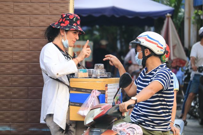 Những ngày này, người dân đi ngang qua chợ Tân Định, quận 1 đều không khỏi tò mò trước hình ảnh một người phụ nữ nước ngoài, mặc quần áo lịch sự, đội mũ vải, đeo theo một thùng xốp bán bánh ngọt.