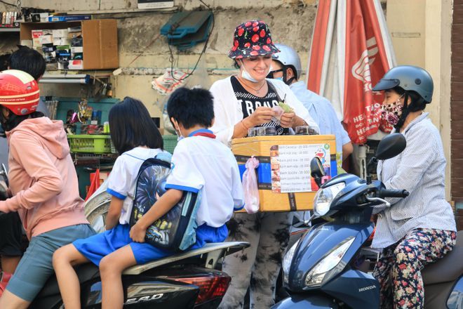 Để thuận tiện cho việc buôn bán, cô đã ghi tên bánh cùng giá bán trên thùng xốp. “Vì không có xe máy nên tôi đi bộ chậm rãi qua các con đường để bán bánh. Buổi sáng tôi bán tại chợ Tân Định, chiều tôi ghé qua trường học, công viên. Tôi và một số người bạn bắt đầu làm bánh gần một năm nay, chất lượng bánh vô cùng quan trọng đối với chúng tôi”, cô cho biết trên Thanh niên.
