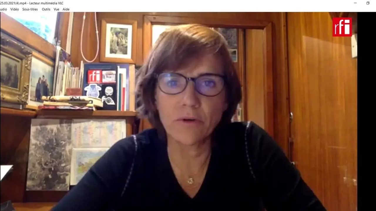 Kư giả Florence de Changy, thông tín viên báo Le Monde và RFI tại Hồng Kông, trong một cuộc trả lời phỏng vấn qua Skype. © Ảnh chụp màn h́nh Skype.