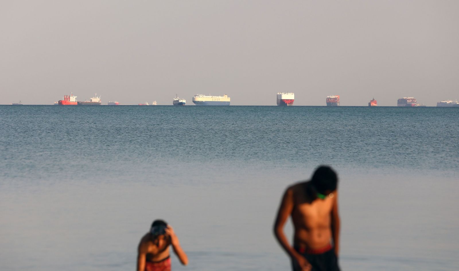 Nhiều tàu hàng neo đậu bên ngoài kênh đào Suez, chờ để được đi qua. Ảnh: EPA - EFE