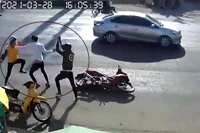 Đang di chuyển trên đường. Bất ngờ có hai kẻ lạ mặt bỏ xe máy giữa đường lao vào đấm đá vơi một nhóm người khác. Do yếu thế nên bị đối thủ đánh "tơi tả", một người gục ngay tại chỗ.