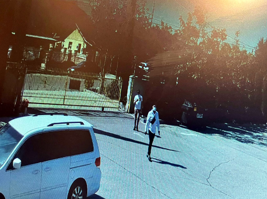 Hai phụ nữ trong băng trộm bước vào sân chùa Tích Lan Dharma Vijaya Buddhist Vihara chiều ngày 22 tháng 3, 2021. (Facebook)