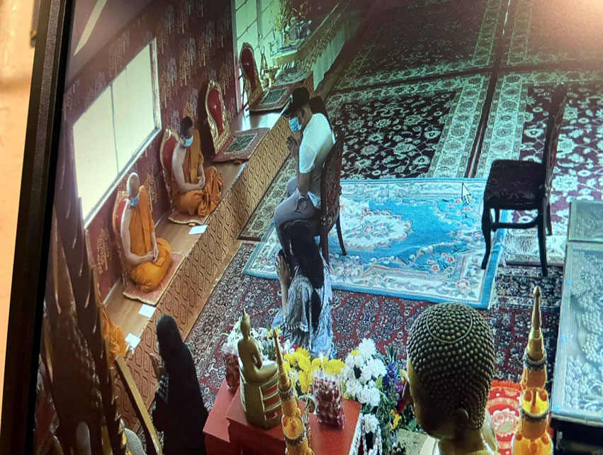 Băng trộm chia làm hai, với một ngồi với các sư và xin cầu an cho cha mẹ của họ, trong khi nhóm thứ hai đi lục tìm tiền bạc để ăn cắp. (Facebook)