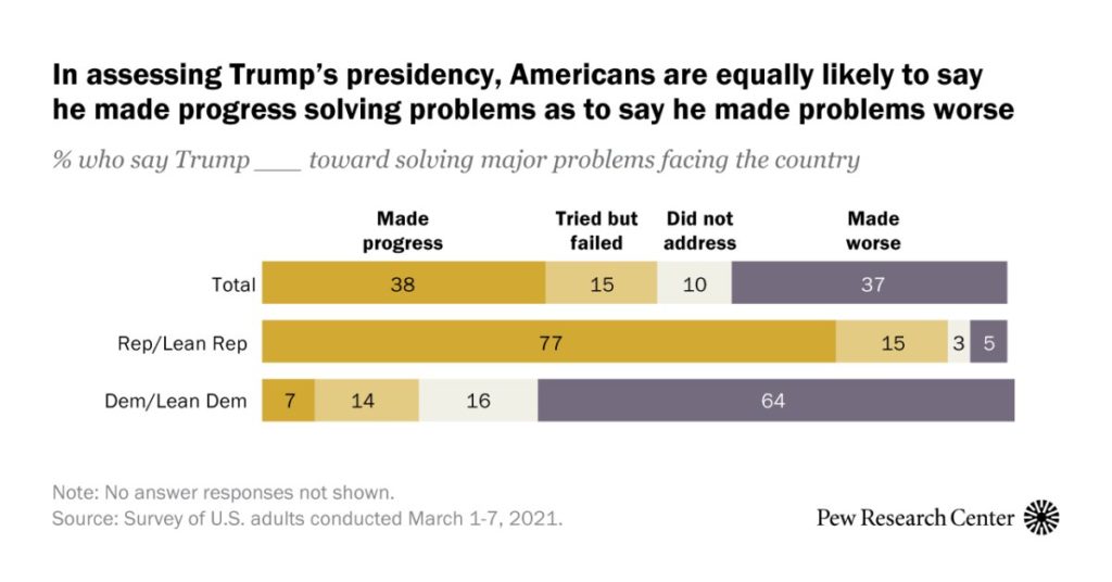 Cũng có một sự chia rẽ đảng phái lớn về câu hỏi này, với 77% đảng viên Cộng hòa nói rằng Trump đã đạt được tiến bộ và 64% đảng viên Dân chủ nói rằng ông đã làm mọi thứ tồi tệ hơn.