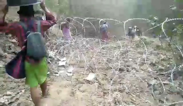Người tị nạn từ Myanmar mang theo đồ đạc khi vượt qua hàng rào dây thép gai ở Mae Hong Son, Thái Lan ngày 29/3 (Ảnh: Reuters).
