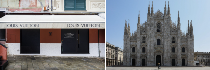 Khung cảnh vắng vẻ ở cửa hàng Louis Vuitton tại Portofino và nhà thờ Gothic Duomo của Milan trong năm 2020.
