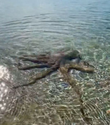Đoạn video ghi lại sự việc cho thấy sinh vật này dùng xúc tu đập mạnh lên mặt nước và khiến nước bắn tung tóe trước khi bơi đi.