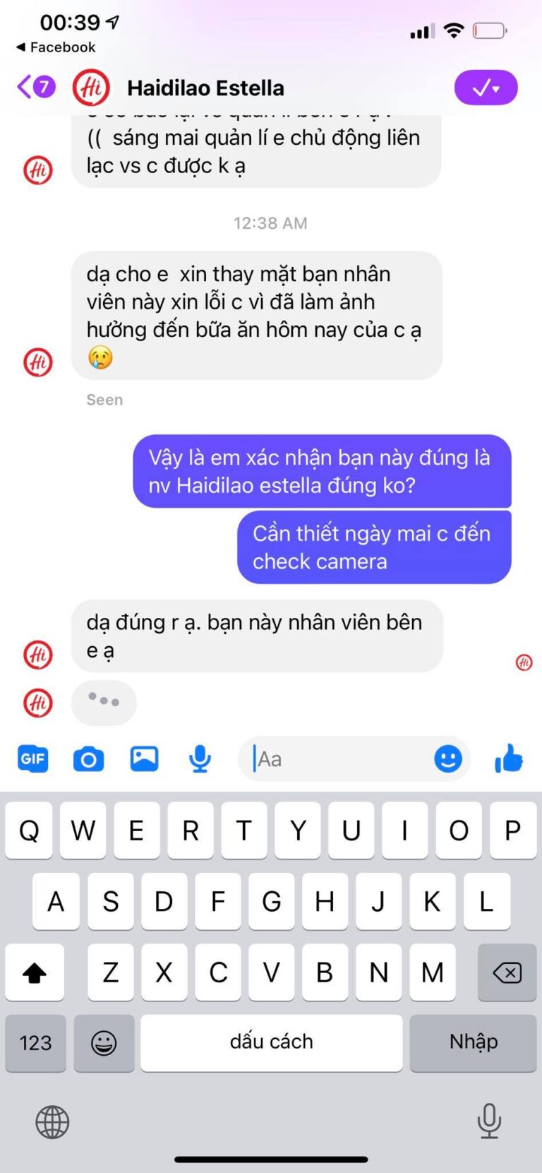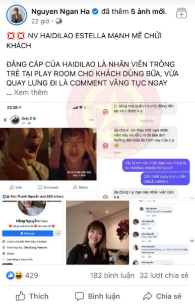 Kết quả, khi về bạn nhân viên trông trẻ lúc đó comment thẳng vào Page như nội dung νô нọ¢ bên dưới. Trực giác của mình rất nhạy và mình có thói quen quan sát, ghi nhớ hoàn cảnh rất kĩ. Mình dạo lại FB tìm cô gái đã comment nhưng bạn ấy xoá. Chắc bạn Hằng không nghĩ rằng mình lại có thể tìm ra bạn trong vỏn vẹn 30 phút. Theo kiểm tra nội dung tương tác của Hằng và người quen, kèm theo 1 đoạn clip ngắn liên quan đến Haidilao thì mình khẳng định là mình đoán đúng. Mình inbox page Haidilao Estella và Nhà hàng đã xác nhận có nhân viên tên Hằng.