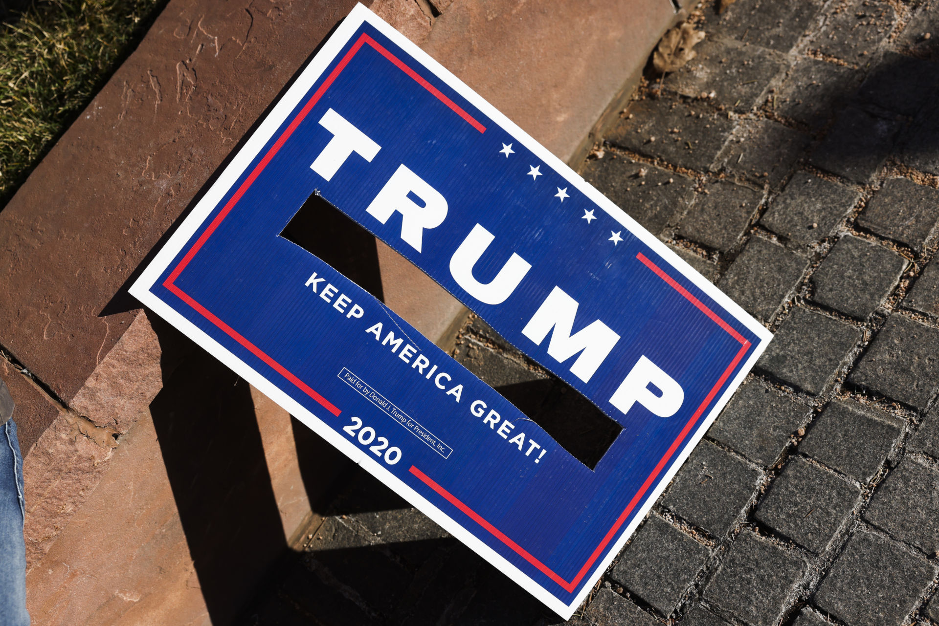 Bảng vận động tranh cử liên danh Trump-Pence bị khoét tên phó tổng thống. (Hình minh họa: Michael Ciaglo/Getty Images)
