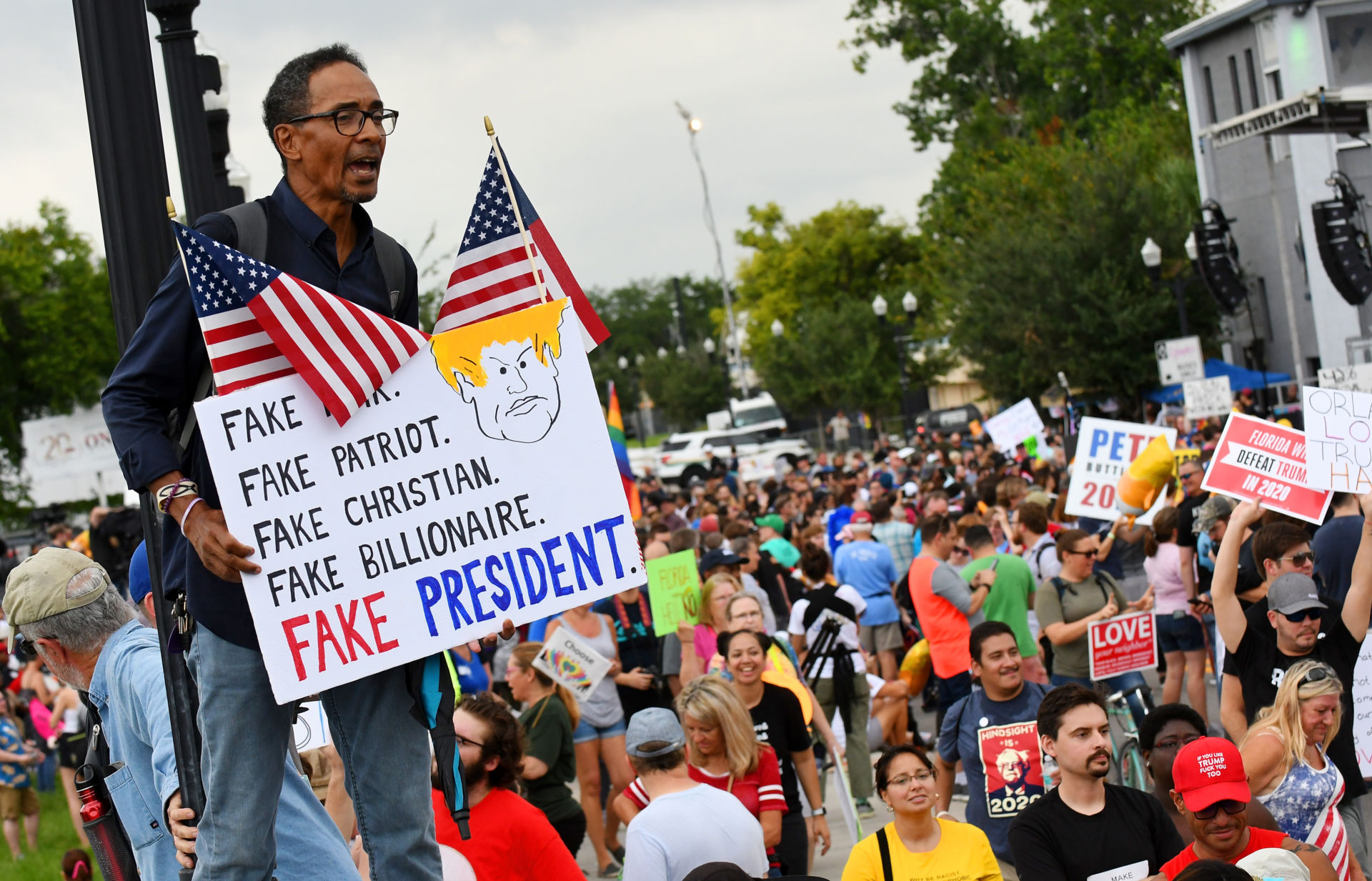 Người biểu tinh phản đối Trump với tấm bảng: “Yêu nước giả hiệu. Tín đồ giả hiệu. Tỷ phú giả hiệu. Tổng thống giả hiệu.” (Hình: Gerardo Mora/Getty Images)