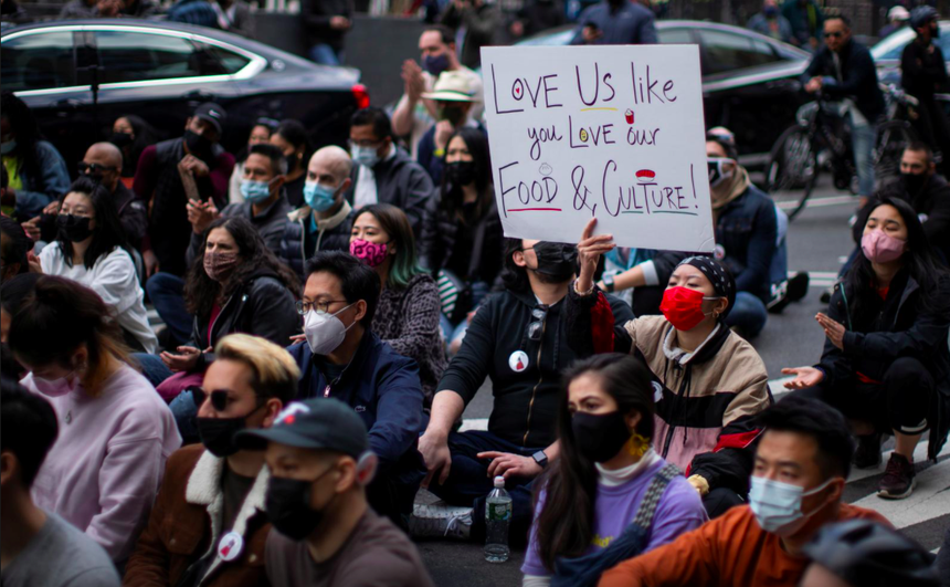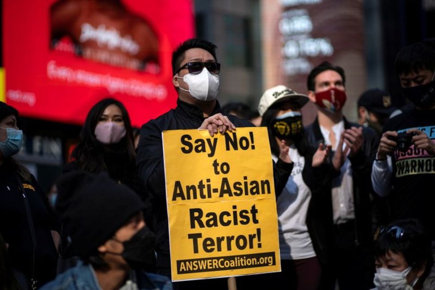 Người dân tham gia biểu tình nhằm ngăn chặn sự thù ghét nhằm vào người châu Á tại Quảng trường Thời đại ở thành phố New York, Mỹ ngày 4/4. Ảnh: Reuters.Cảnh sát và người dân đồng lòng