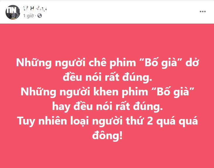 Cách đây không lâu, trên trang cá nhân của mình, đạo diễn Lê Hoàng cũng có đôi lời chia sẻ quan điểm của ông về phim điện ảnh Việt đình đám nhất hiện nay – Bố Già. Nam đạo diễn bày tỏ: “Những người chê phim Bố Già dở đều nói rất đúng. Những người khen phim Bố Già hay đều nói rất đúng. Tuy nhiên loại người thứ 2 quá đông!”.