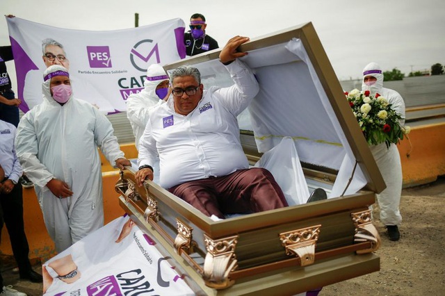 Theo AFP, ông Carlos Mayorga, ứng cử viên hạ viện của đảng Encuentro Solidario tại bang phía bắc Chihuahua, đã tuyên bố ra tranh cử hôm 6/4 bằng cách sử dụng quan tài. Động thái của ông nhằm nhấn mạnh rằng Mexico đang phải vật lộn với tình trạng dịch bệnh Covid-19 khiến hàng trăm nghìn người chết, cũng như các hành vi bạo lực liên quan tới các tổ chức tội phạm.