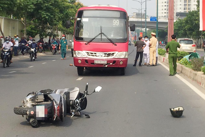 Vừa qua khỏi cầu vượt khu công nghệ cao thuộc phường Tăng Nhơn Phú A (TP Thủ Đức), xe buýt va chạm với xe máy mang biển kiểm soát TP.HCM do người đàn ông khoảng 50 tuổi cầm lái.