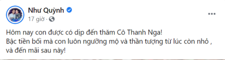 Mới đây, trên trang Facebook ca sĩ Như Quỳnh đã chia sẻ, về người mà cô thần tượng từ nhỏ đó là cố nghệ sĩ cải lương Thanh Nga. Như Quỳnh viết: “Hôm nay con được có dịp đến thăm cô Thanh Nga!