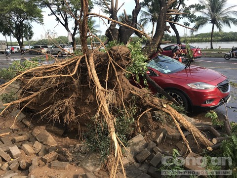 Khi chiếc xe vừa dừng bánh thì cây xanh lớn trên vỉa hè bị bật gốc ngã ra đường đè lên chiếc ô tô nói trên.