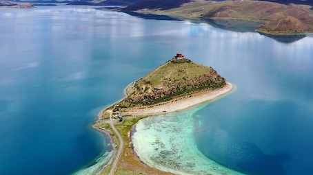 Chỉ có một dải đất hẹp dẫn từ bờ hồ Yamdrok đến ngôi chùa.