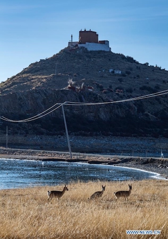 Đứng trên đỉnh của chùa, bạn có thể nhìn thấy những con linh dương Tây Tạng chạy nhảy tự do và những đàn ngỗng hoang bơi lội trong hồ.