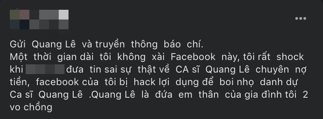 Cùng lúc đó, cư dân mạng hoang mang khi chứng kiến “plot twist” cực “hack não” từ người lên tiếng tố Quang Lê. Theo đó, người này đính chính trên Facebook cá nhân: “Gửi Quang Lê và truyền thông. Một thời gian dài tôi không sử dụng Facebook này, tôi rất sốc khi có tin sai sự thật về ca sĩ Quang Lê chuyên nợ tiền. Facebook của tôi bị hack, lợi dụng để bôi nhọ danh dự ca sĩ Quang Lê. Quang Lê là đứa em thân của gia đình hai vợ chồng tôi”.