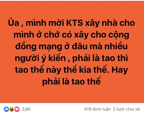 Bên cạnh đó, khi thấy cộng đồng mạng tranh cãi về việc bỏ chi phí hơn 7 tỷ đồng để thuê một nhà thiết kế nổi bật hàng đầu Việt Nam, cô phản pháo: “Ủa, mình mời kiến trúc sư xây nhà cho mình ở chớ có xây cho cộng đồng mạng ở đâu mà nhiều người ý kiến. Phải là tao thì tao thế này thế kia thế. Hay phải là tao thế”.