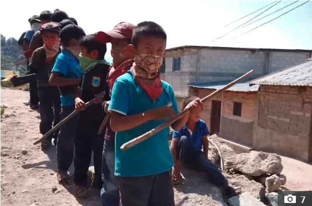 Đội mũ lưỡi trai và quấn khăn che kín mặt, nhóm "dân quân nhí" mang theo súng và gậy gộc nhằm thu hút sự chú ý của chính phủ Mexico.
