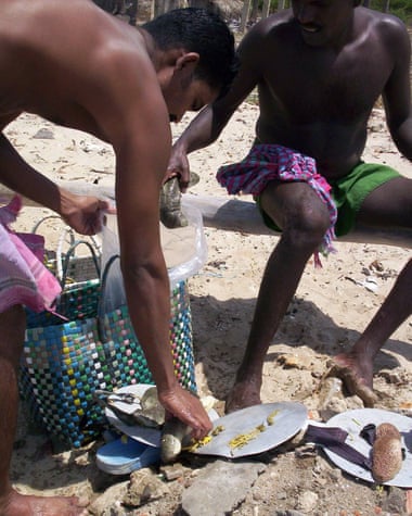 Ngư dân thu hoạch hải sâm bắt được trên Vịnh Mannar. Ảnh: Guardian.