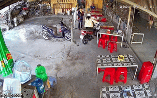 Camera an ninh của quán ăn đã ghi lại toàn bộ sự cố "khóc dở mếu dở" do người phụ nữ chạy xe máy cẩu thả gây ra vào đầu giờ sáng ngày 12/4 vừa qua.
