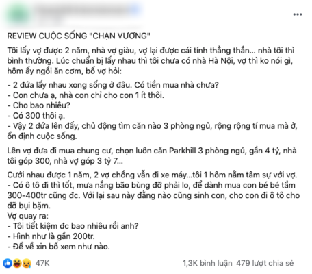 Lên vợ đưa đi mua chung cư, chọn luôn căn Park Hill 3 phòng ngủ, gần 4 tỷ, nhà tôi góp 300 triệu, nhà vợ góp 3 tỷ 700 triệu đồng,…”