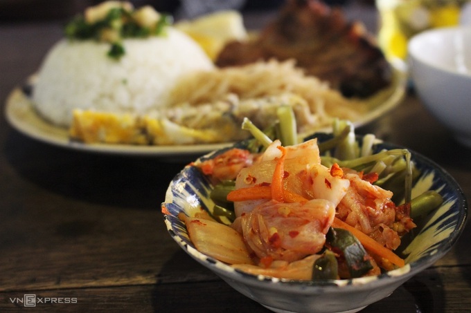 Ngoài sự bí hiểm về không gian, món ăn tại đây cũng gây tò mò cho du khách. Cơm tấm ở quán là cách pha trộn giữa cơm tấm Việt Nam cùng kim chi Hàn Quốc tạo nên sự mới lạ về hương vị. Món cơm tấm ban đầu ở quán có thịt sườn nướng, bì, chả, trứng, rau muống ngâm chua ăn cùng nước mắm tỏi ớt pha ngọt kiểu miền Nam. Những người lính Đại Hàn ăn không quen nên đề xuất chủ quán làm thêm kim chi.