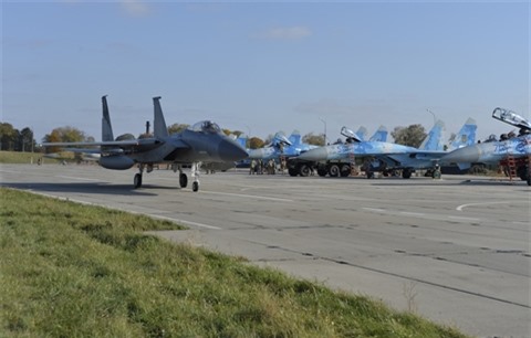Tiêm kích F-15 của Mỹ trong một cuộc huấn luyện chung với Su-27 của Ukraine