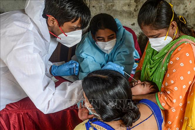 Nhân viên y tế lấy mẫu xét nghiệm COVID-19 tại Mumbai, Ấn Độ. Ảnh: AFP/TTXVN