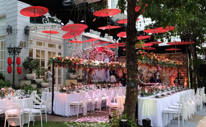 Những chi tiết nhỏ nhất trong buổi tiệc đều được chăm chút. Toàn bộ ghế mời của khách được trang trí màu trắng.