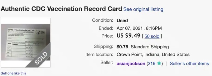 Tài khoản eBay có tên asianjackson, thuộc về một dược sĩ ở khu vực Chicago, đăng ba "mặt hàng" giấy chứng nhận tiêm chủng vaccine Covid-19 của Trung tâm Kiểm soát và Phòng ngừa Dịch bệnh Mỹ (CDC) với các mức giá 8,99 USD, 9,49 USD và 10,99 USD. Theo các nhà quản lý liên bang, toàn bộ số giấy chứng nhận tiêm chủng này đều bất hợp pháp.