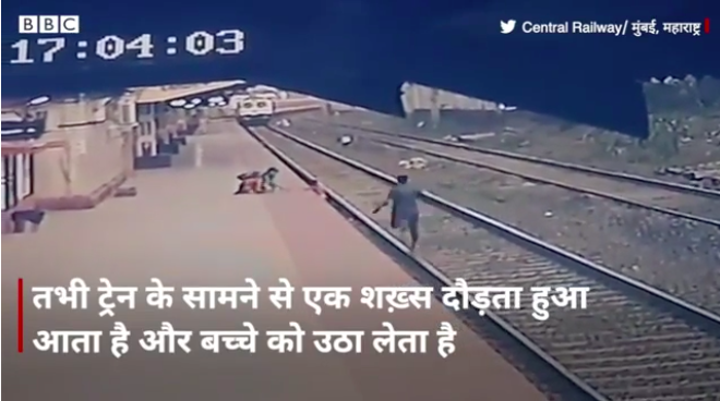 Hình ảnh từ đoạn video cho thấy một nhân viên làm việc tại nhà ga Vangani ở thành phố Mumbai đã chạy về phía đường ray để giải cứu một đứa trẻ, khi một đoàn tàu đang lao nhanh về phía họ.