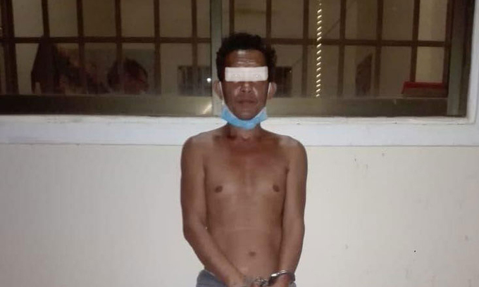 Yun Seang Hy bị còng tay tại đồn cảnh sát xã Romchek, tỉnh Kampong Cham, Campuchia, hôm 17/4. Ảnh: Khmer Times.