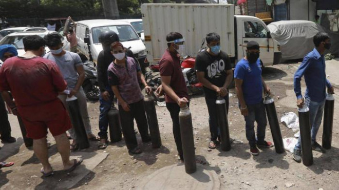 Một cảnh xếp hàng chờ nạp bình oxy tại New Delhi