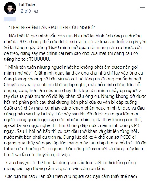Mạng xã hội rầm rộ chia sẻ câu chuyện của Lại Tuấn - một thanh niên Việt Nam đang sống và làm việc tại Nhật Bản. Cụ thể, anh Tuấn cho biết mình đang mở quán thì nghe tiếng kêu thất thanh và một ông cụ đang loạng choạng bị ngã. Dù tình huống bất ngờ và khá luống cuống như anh Tuấn vẫn kịp thời đỡ ông cụ dù sau đó cả hai đều bị thương nhưng ông cụ may mắn vẫn được cứu sống..