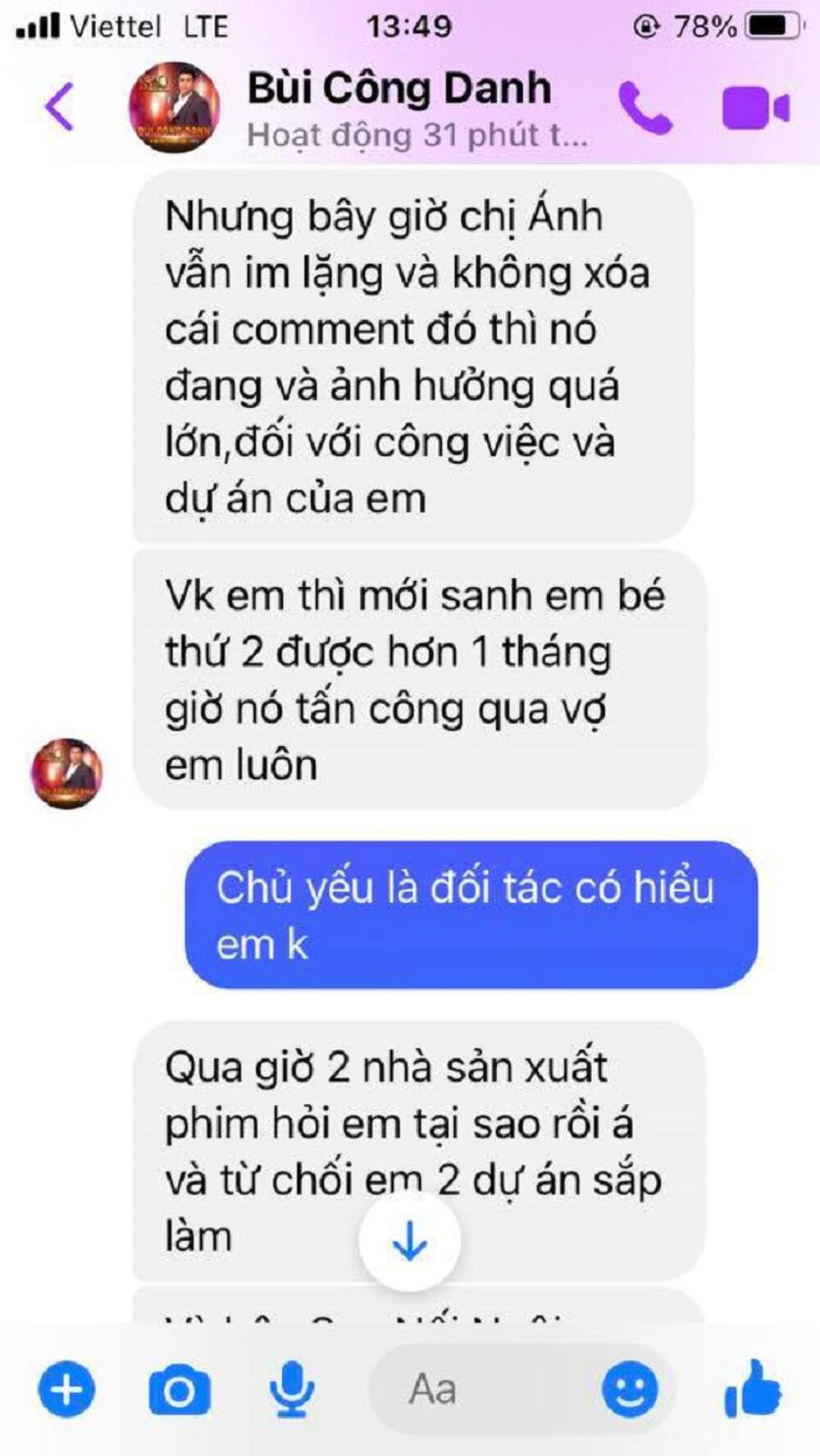 Bùi Công Danh tâm sự: "Nhưng bây giờ chị Ánh vẫn im lặng và không xóa bình luận đó thì nó đang và ảnh hưởng quá lớn đối với công việc cũng như dự án của em. Vợ em thì mới sinh em bé thứ hai được 1 tháng, giờ mọi người tấn công qua tới vợ em luôn".