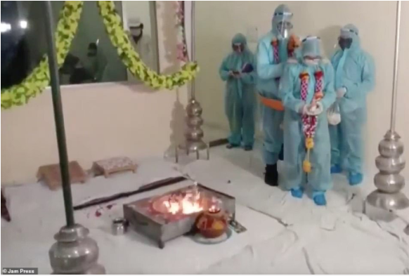 Một cặp đôi trong trang phục bảo hộ làm lễ kết hôn theo các nghi thức truyền thống.