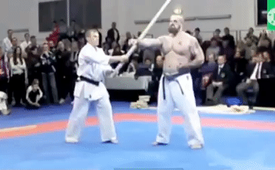 Đệ tử của ông đã cố gắng vụt rất mạnh theo đúng kỹ thuật nhưng chiếc gậy chẳng thể nào gãy nổi. Anh chàng này thay một chiếc gậy khác nhưng mọi thứ vẫn… đâu vào đấy. Sau vài cú chịu đòn, võ sư karate do bị đau đã buộc phải bỏ màn biểu diễn, chấp nhận "dừng cuộc chơi".