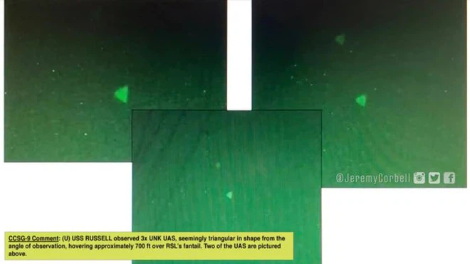Hình ảnh ghi lại vật thể hình tam giác bay lơ lửng trên tàu USS Russell năm 2019. Ảnh: Jeremy Corbell.