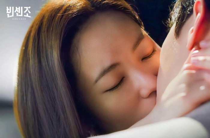 Trước đó, trong tập 14 của phim, khoảnh khắc tình tứ của bộ đôi nam nữ chính Vincenzo (Song Joong Ki) và Hong Cha Young (Jeon Yeo Bin) cũng đã từng gây sốt với màn hôn đặc biệt. Trong tập này, cặp đôi đã có cảnh hôn đầu tiên sau khi cả hai đã trải qua nhiều biến cố, cảnh hôn này cũng đánh dấu cả hai từ đối tác trở thành một đôi tình nhân.
