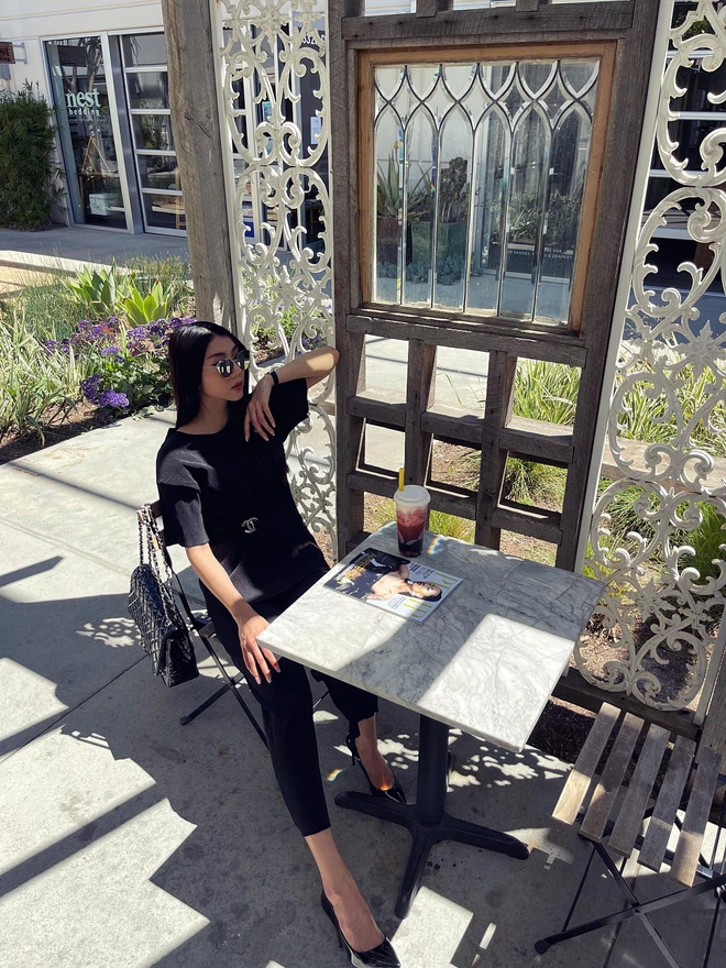 Khi ra ngoài, nữ siêu mẫu cũng sửa soạn nhanh trong 10 phút, giày cao gót thay bằng giày dép bệt.