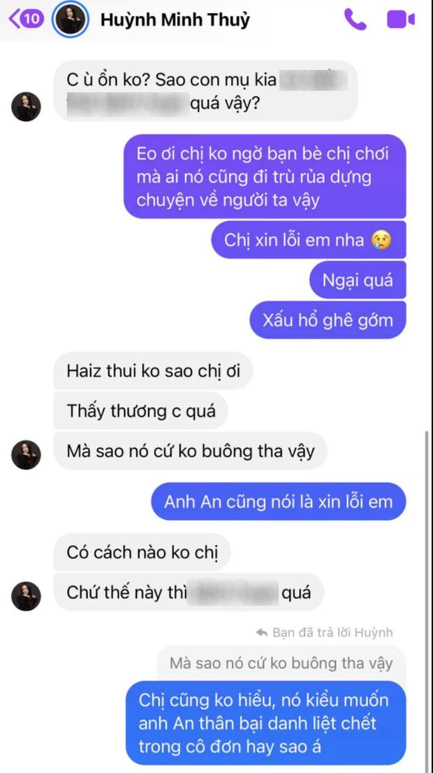 Để làm sáng tỏ mọi thứ và giữ thanh danh cho chồng, cô cũng đã nhắn tin trực tiếp cho cựu hot girl đình đám Hà thành. Biết được sự việc, Thủy Top cũng không giấu được sự khó chịu. Phan Như Thảo cũng đã đại diện đại gia Đức An gửi lời xin lỗi đến Thủy Top vì bị lôi vào ồn ào.