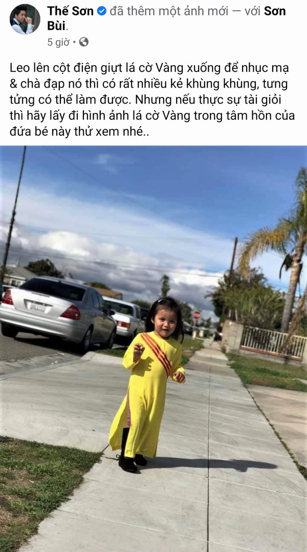 "Leo lên cột điện giựt lá cờ Vàng xuống để nhục mạ & chà đạp nó th́ có rất nhiều kẻ khùng khùng, tưng tửng có thể làm được. Nhưng nếu thực sự tài giỏi th́ hăy lấy đi h́nh ảnh lá cờ Vàng trong tâm hồn của đứa bé này thử xem nhé.." Danh ca Hải Ngoại nam ca sĩ Thế Sơn chia sẻ cảm nghĩ của ḿnh trên trang cá nhân.