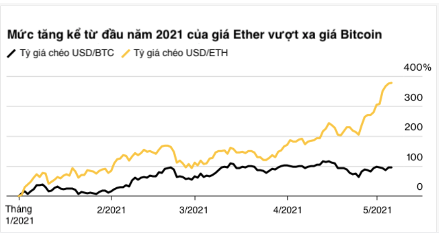 Giá Bitcoin tăng gần 100% kể từ đầu năm 2021 đến nay, trong khi giá Ether leo dốc gần 400%.Đầu tư vào Ether hay Bitcoin?