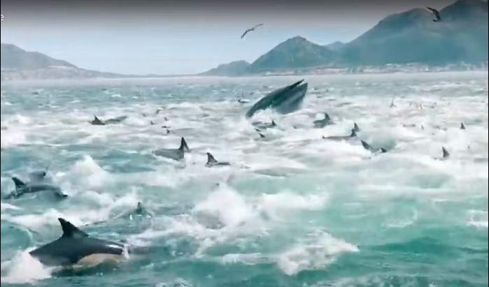 Video ghi lại sự việc cho thấy hàng nghìn con cá heo với những cú nhảy vòng tròn làm xáo động cả một vùng biển. Ngạc nhiên hơn khi có 3 con cá voi lưng gù cùng tham gia vào màn "trình diễn" này.