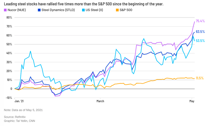 Cổ phiếu thép cũng đang cháy hàng. Cổ phiếu US Steel giảm xuống mức thấp kỷ lục vào tháng 3/2020 trong bối cảnh lo ngại phá sản, hiện đã tăng vọt 200% chỉ trong 12 tháng. Cổ phiếu của Nucor đã tăng vọt 76% từ đầu năm đến nay.